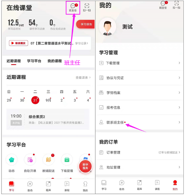 學(xué)員可以通過APP【課程】右上角“班主任”,聯(lián)系配套課程的班主任溝通直播課等相關(guān)問題。