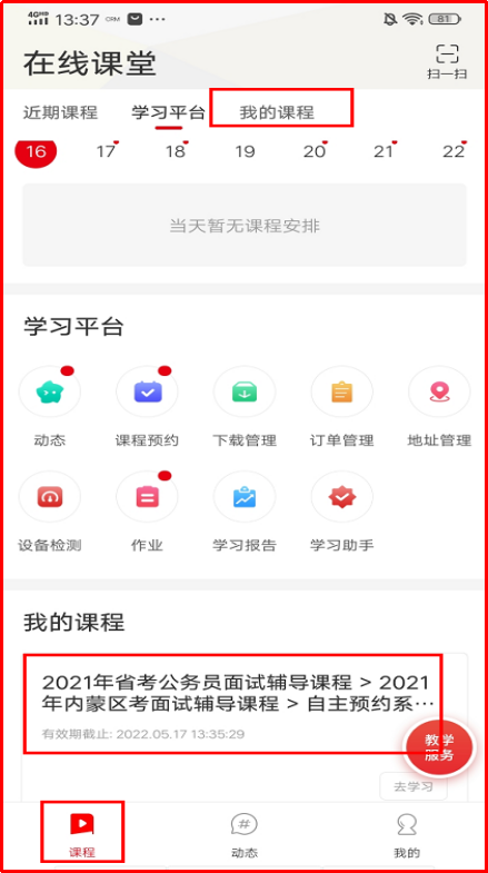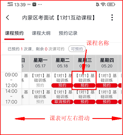 1.點擊“課程預約”可查看課表,并根據自己的時間預約上課