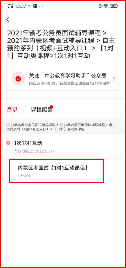 示例:以下以2021年省考公務員面試輔導課程 > 2021年內蒙區(qū)考面試輔導課程 > 自主預約系列(視頻+互動入口) > 【1對1】互動類課程為例。