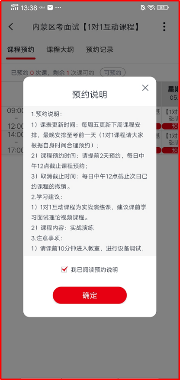 1.點擊“1對1互動課程”進入之后先進行查看預約說明,登錄互動課程首頁后,在開課狀態(tài)下的課程,在預約互動課程時---會跳轉顯示預約說明的頁面,請仔細閱讀并確認。