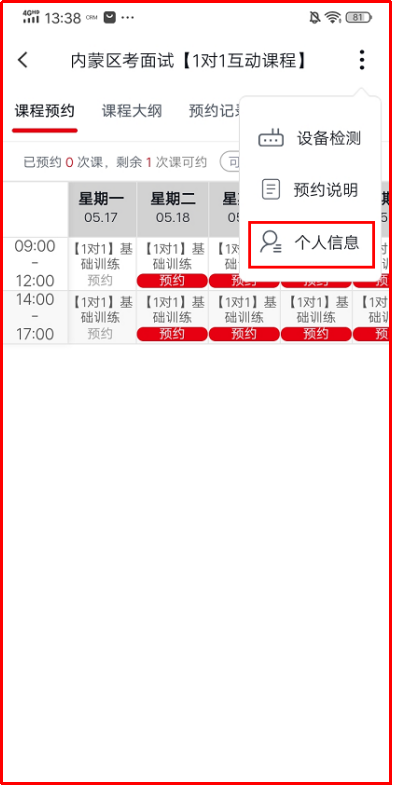 登錄中公網校在線課堂APP-首頁最下端第一個板塊【課程】-找到含有一對一的課程-n次1對1互動-點擊進入-課程預約(課表)。