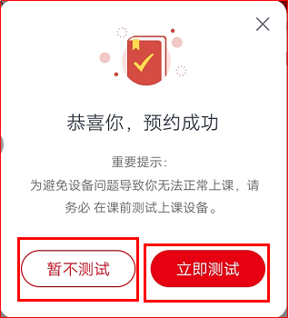3.確認預約后,提前關注中公網校學習助手接收課程提醒并根據提示進行個人上課設備的檢測,可以自行選擇“暫不測試”或“立即測試”