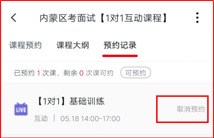 (1)面試1對1互動課程,每天中午12點截止次日課程的預約,如若更改預約時間或臨時有事需要取消課程,需要在開課前1天中午12點之前點擊預約記錄--點擊“取消預約”;