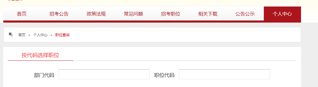 然后在系統(tǒng)里“個人中心”-“職位查詢”輸入自己所選職位的部門代碼和職位代碼進行報名。