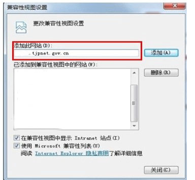 接著把天津市公開選調公務員或者公開遴選公務員報名的網(wǎng)站添加到兼容性視圖網(wǎng)站中去,如下圖所示