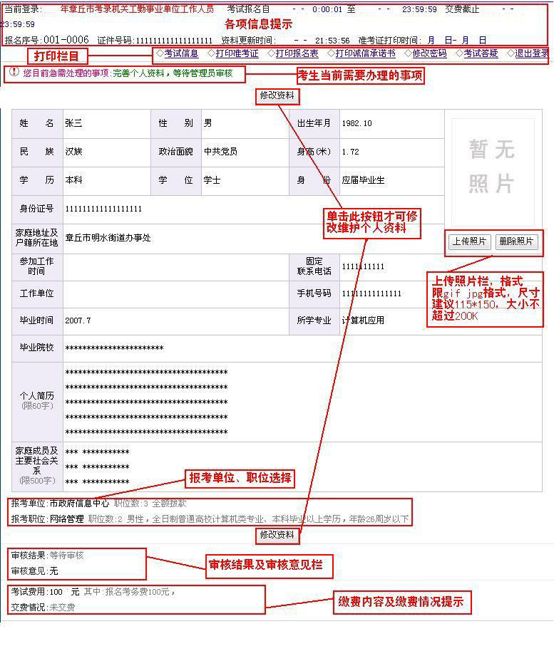 5、考生信息輸入完畢,單擊“保存資料”按鈕后即可將個人資料保存。此時考生可等待資格初審,資格審核結(jié)果和審核意見將在考生個人信息界面中顯示,具體提示信息顯示的位置及說明見下圖: