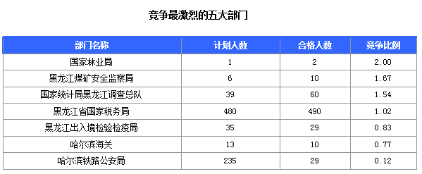 截止15日17時,招錄比例的職位為黑龍江省國家稅務(wù)局齊齊哈爾市富拉爾基區(qū)國家稅務(wù)局科員一職,招錄2人,通過人數(shù)48人,競爭比24:1。