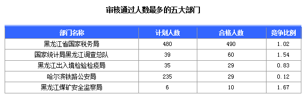截止15日17時,通過審核人數(shù)前三位的部門依次是:黑龍江省國家稅務(wù)局、國家統(tǒng)計局黑龍江調(diào)查總隊、黑龍江出入境檢驗檢疫局,三部門通過審核總?cè)藬?shù)達579人,占通過審核總?cè)藬?shù)的91.9%。
