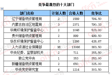 競(jìng)爭(zhēng)最激烈的兩個(gè)部門——遼寧儲(chǔ)備物資管理局與內(nèi)蒙古自治區(qū)地震局“并駕齊驅(qū)”,競(jìng)爭(zhēng)比分別達(dá)到794.5:1和790.3:1。
