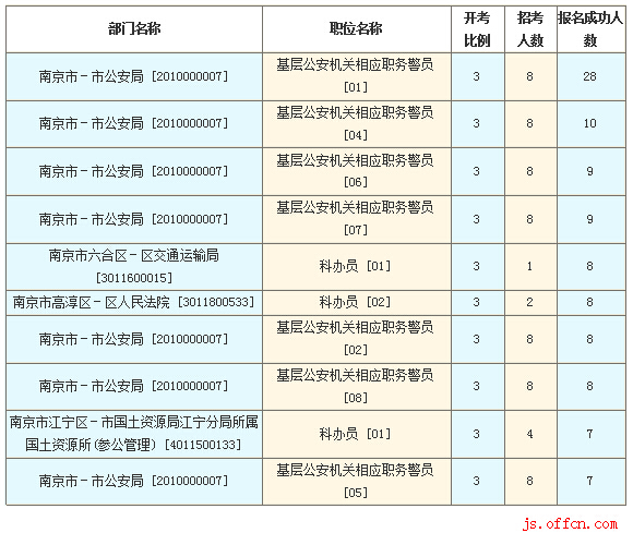 截至11日16時,南京市報名人數(shù)最多的職位為:基層公安機關相應職務警員 [01],一共有28人報名,競爭最激烈的職位為科辦員 [01],招錄1人,報名人數(shù)為8人,報名通過審核人數(shù)前十的職位主要集中在南京市-市公安局 [2010000007]、南京市六合區(qū)-區(qū)交通運輸局 [3011600015],具體信息如下:
