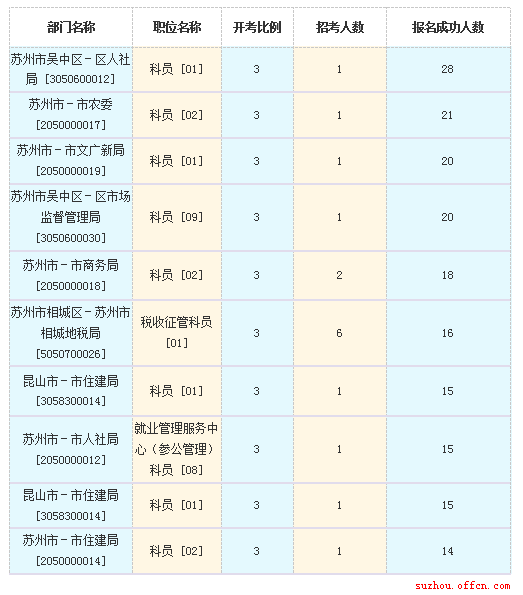 截至12日16時(shí),蘇州市報(bào)名人數(shù)最多的職位為:蘇州市吳中區(qū)-區(qū)人社局科員 [01],一共有28人報(bào)名,競(jìng)爭(zhēng)最激烈的職位也是蘇州市吳中區(qū)-區(qū)人社局科員 [01],招錄1人,報(bào)名人數(shù)為28人,報(bào)名通過(guò)審核人數(shù)前十的職位主要集中在蘇州市吳中區(qū)-區(qū)人社局 [3050600012]、蘇州市市農(nóng)委[2050000017]和市文廣新局[2050000019]、吳中區(qū)市場(chǎng)監(jiān)督管理局[3050600030]、相城地稅局[5050700026]等部門(mén),具體信息如下: