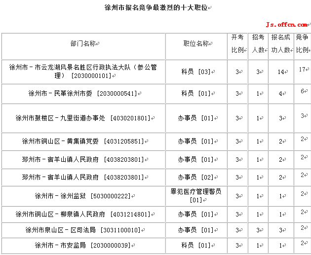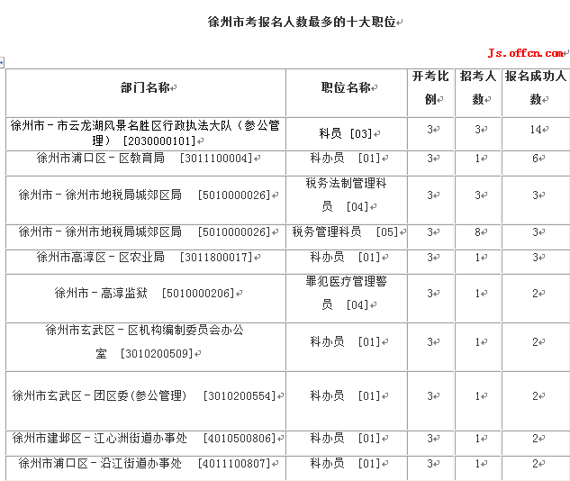 截至11日16時(shí),徐州市報(bào)名人數(shù)最多的職位為:科辦員 [03],一共有14人報(bào)名,競(jìng)爭(zhēng)最激烈的職位為科辦員 [03],招錄3人,報(bào)名人數(shù)為14人,報(bào)名通過審核人數(shù)前十的職位主要集中在徐州市-市云龍湖風(fēng)景名勝區(qū)行政執(zhí)法大隊(duì)(參公管理)[2030000101]、徐州市-民革徐州市委 [2030000541],具體信息如下: