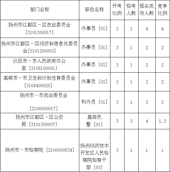 截至11日16時(shí),揚(yáng)州市報(bào)名人數(shù)最多的職位為:揚(yáng)州市江都區(qū)-區(qū)農(nóng)業(yè)委員會(huì)[3101200017]辦事員[01],一共有4人報(bào)名,競(jìng)爭(zhēng)最激烈的職位為揚(yáng)州市江都區(qū)-區(qū)農(nóng)業(yè)委員會(huì)[3101200017]辦事員[01],招錄1人,報(bào)名人數(shù)為4人,報(bào)名通過審核人數(shù)前十的職位主要集中在揚(yáng)州市江都區(qū)-區(qū)公安局 [3101200007]、揚(yáng)州市-市農(nóng)業(yè)委員會(huì)[2100000017],具體信息如下: