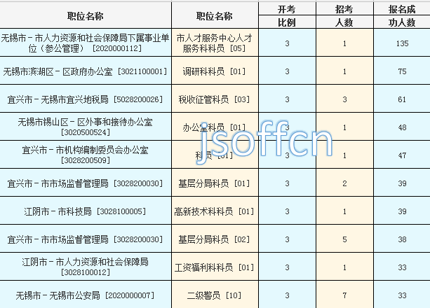 截至14日16時,無錫市報名人數(shù)最多的職位為:無錫市-市人力資源和社會局下屬事業(yè)單位(參公管理) [2020000112],市人才服務(wù)中心人才服務(wù)科科員 [05],一共有135人報名,報名通過審核人數(shù)前五的職位主要集中在: 無錫市-市人力資源和社會局下屬事業(yè)單位(參公管理) [2020000112]、無錫市濱湖區(qū)-區(qū)政府辦公室 [3021100001]、宜興市-無錫市宜興地稅局 [5028200026]、無錫市錫山區(qū)-區(qū)外事和接待辦公室 [3020500524]、宜興市-市機構(gòu)編制委員會辦公室 [3028200509]等十大職位,截止今天報名最多和競爭最激烈的職位依然是無錫市-市人力資源和社會局下屬事業(yè)單位(參公管理) [2020000112],多個職位報名人數(shù)十位數(shù),但依然有23個職位無人報名。