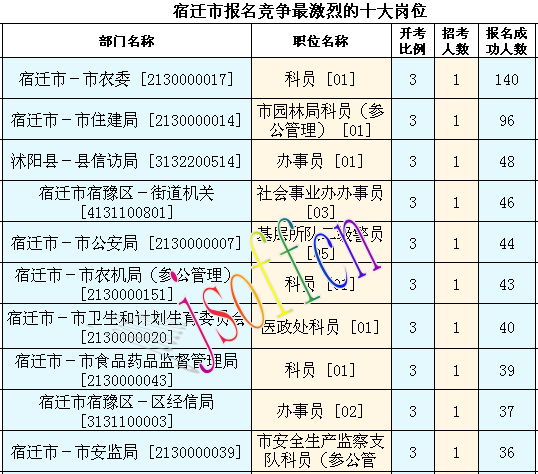 截至16日16時(shí),宿遷市報(bào)名人數(shù)最多的職位為:宿遷市宿城區(qū)-鄉(xiāng)鎮(zhèn)機(jī)關(guān) [4130200802],一共有143人報(bào)名,競爭最激烈的職位為宿遷市-市農(nóng)委 [2130000017],招錄1人,報(bào)名人數(shù)為140人,報(bào)名通過審核人數(shù)前十的職位主要集中在宿遷市宿城區(qū)-鄉(xiāng)鎮(zhèn)機(jī)關(guān) [4130200802]、宿遷市-市農(nóng)委 [2130000017],具體信息如下:
