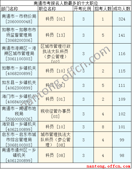 截至16日16時(shí),南通市報(bào)名人數(shù)最多的職位為:科員 [01],一共有324人報(bào)名,競(jìng)爭(zhēng)最激烈的職位為也是這個(gè)報(bào)名最多的科員[01],招錄1人,報(bào)名人數(shù)為324人,報(bào)名通過(guò)審核人數(shù)前十的職位比較集中,主要是南通市區(qū)和縣區(qū)鄉(xiāng)鎮(zhèn)機(jī)關(guān),如南通市-市物價(jià)局[2060000048]、如皋市-鄉(xiāng)鎮(zhèn)機(jī)關(guān)[4068200899],具體信息如下: