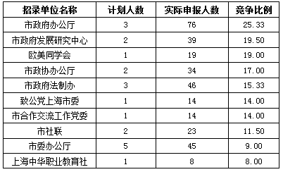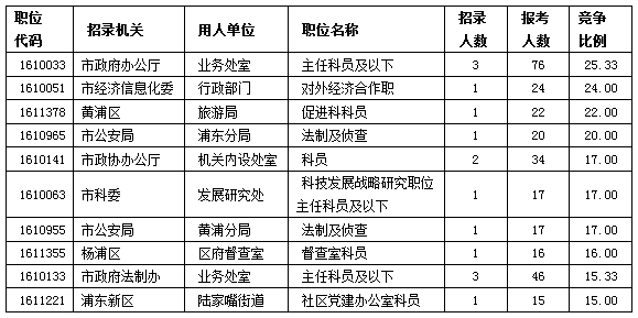 目前競爭最激烈、考生們應(yīng)該考慮放棄的職位是市政府辦公廳業(yè)務(wù)處室主任科員及以下(職位代碼1610033)這一職位,僅招錄3人,目前已經(jīng)有76人報(bào)名,競爭比例超過25:1,考上的難度比較大。