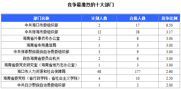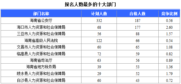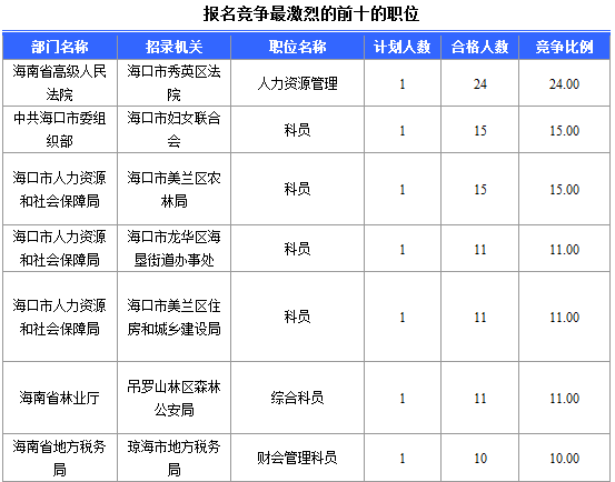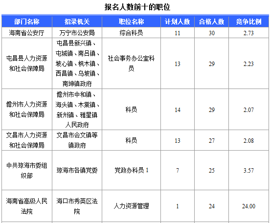 報(bào)名通過審核人數(shù)前十的職位主要集中在海南省高級(jí)人民法院、??谑腥肆Y源和社會(huì)局、海南省林業(yè)廳,具體信息如下: