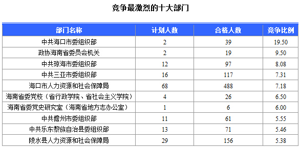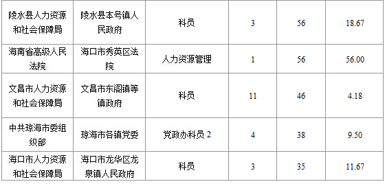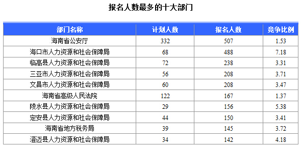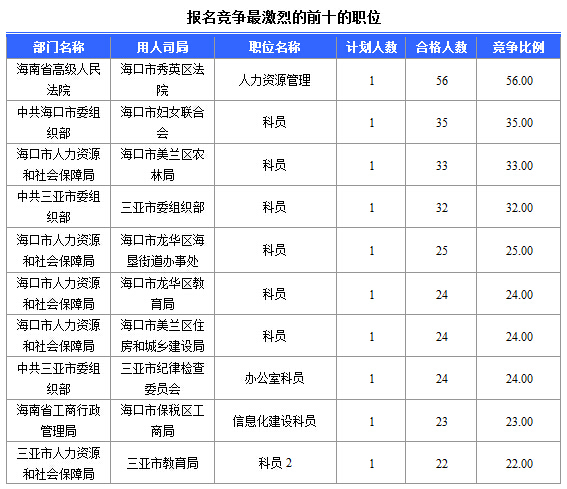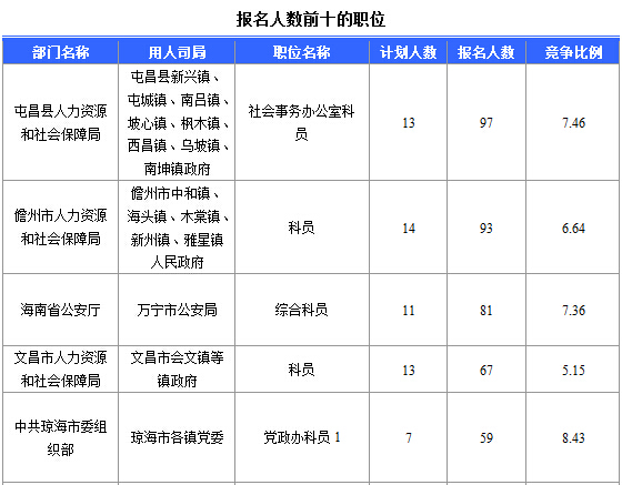 報名通過審核人數(shù)前十的職位主要集中在海南省高級人民法院、海口市人力資源和社會局、海南省林業(yè)廳,具體信息如下:
