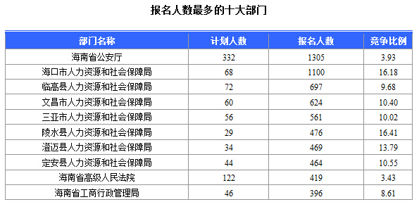 截至16日9時,報名人數(shù)前三位的部門依次是:海南省公安廳、海口市人力資源和社會局、臨高縣人力資源和社會局,三部門報名總?cè)藬?shù)達3102人,占報名總?cè)藬?shù)的24.4%。