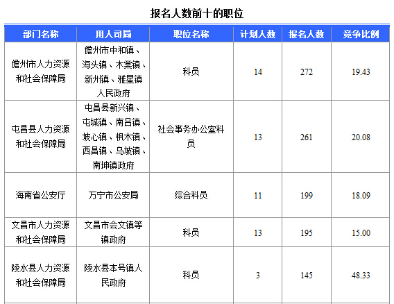 報名通過審核人數(shù)前十的職位主要集中在各大人力資源廳,具體信息如下: