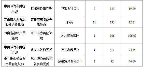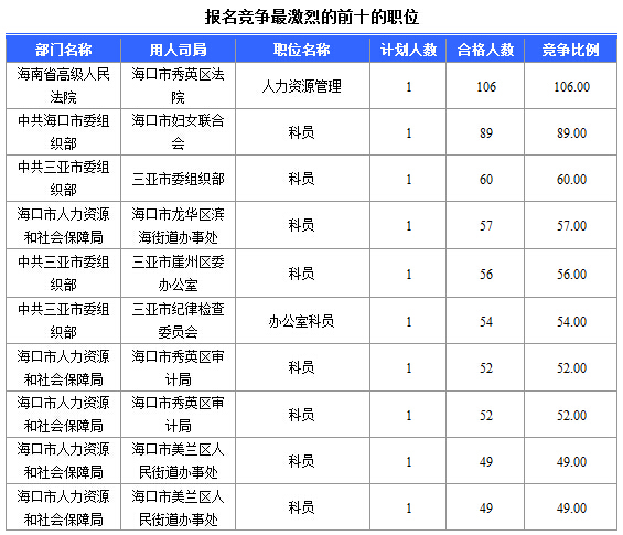 截止16日9時,招錄比例的職位為海南省高級人民法院??谑行阌^(qū)法院人力資源管理一職,招錄1人,截止16日9時通過人數(shù)為106人。