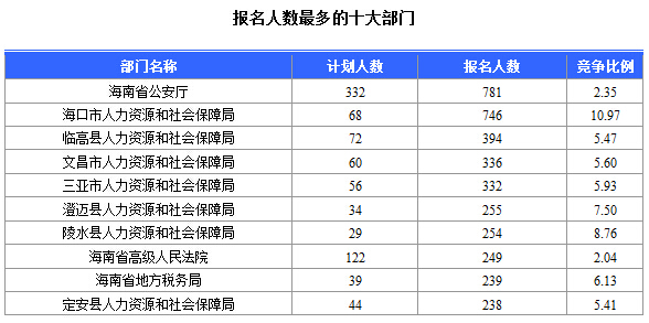 截至15日16時,報名人數(shù)前三位的部門依次是:海南省公安廳、??谑腥肆Y源和社會局、臨高縣人力資源和社會局,三部門報名總?cè)藬?shù)達(dá)1921人,占報名總?cè)藬?shù)的26.1%。