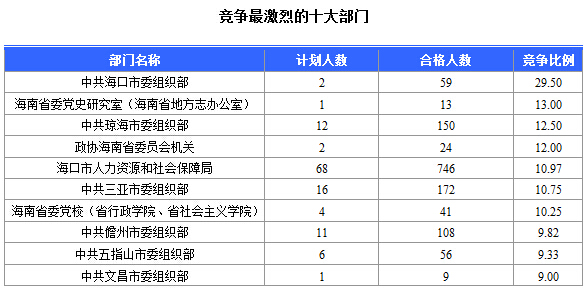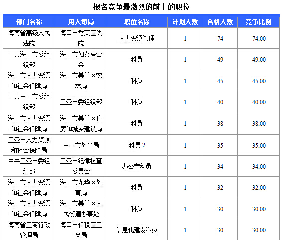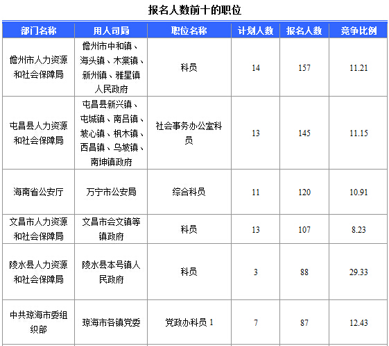 報名通過審核人數(shù)前十的職位主要集中在各大人力資源廳,具體信息如下: