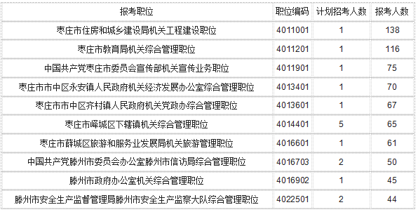2016年省考報名棗莊地市所屬的職位中,報名人數(shù)前三位的職位依次是:滕州市安全生產(chǎn)監(jiān)督管理局滕州市安全生產(chǎn)監(jiān)察大隊綜合管理職位、滕州市政府辦公室機關(guān)綜合管理職位、中國共產(chǎn)黨滕州市委員會辦公室滕州市信訪局綜合管理職位,報考人數(shù)分別為138人、116人、75人。其中滕州市安全生產(chǎn)監(jiān)督管理局滕州市安全生產(chǎn)監(jiān)察大隊綜合管理職位競爭最為激烈,報名首日報考人數(shù):招考人數(shù)的比例已達138:1.