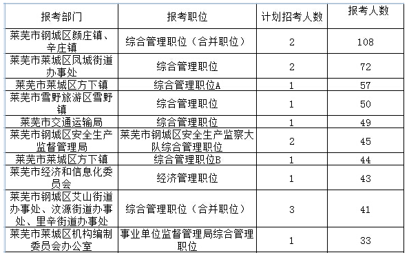 2016年萊蕪市所屬的職位中,報名人數(shù)最多的職位是:萊蕪市鋼城區(qū)顏莊鎮(zhèn)、辛莊鎮(zhèn)的綜合管理職位(合并職位),萊蕪市萊城區(qū)鳳城街道辦事處的綜合管理職位,萊蕪市萊城區(qū)方下鎮(zhèn)的綜合管理職位A,報名人數(shù)均大于50。