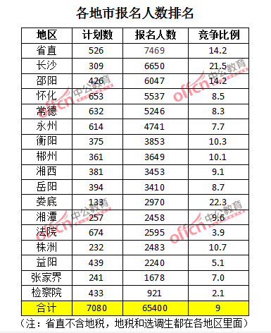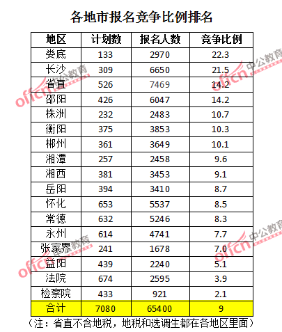 截止25日17時,湖南省公務(wù)員考試報(bào)考競爭比例整體為9:1,婁底、長沙、省直、邵陽、株洲、衡陽和郴州地區(qū)報(bào)考競爭比例超過10:1,省直報(bào)考競爭比例為14.2:1。