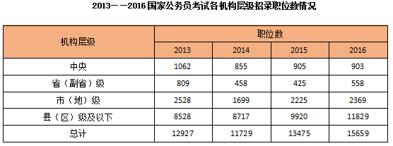 據(jù)中公網(wǎng)校根據(jù)官方發(fā)布的職位表統(tǒng)計(jì),2013年到2016年國(guó)家公務(wù)員考試中央、省(副省)級(jí)、市(地)級(jí)、縣(區(qū))級(jí)及以下這四個(gè)機(jī)構(gòu)層級(jí)共招錄的人數(shù)為分別為20879人、19538人、22249人和27817人。2013年到2016年這四年間,中央和省(副省)級(jí)的招錄人數(shù)基本持平,2014年市(地)級(jí)招錄人數(shù)較2013年下降了798人,2015年較2014年回漲450人,2016年增漲勢(shì)頭持續(xù),招錄的人數(shù)較2015年增加了635人??h(區(qū))級(jí)及以下在2013年到2016年這4年間實(shí)現(xiàn)“三連漲”,招錄漲幅分別是2.27%、13.98%、27.35%,2016年較2015年的漲幅創(chuàng)造了歷年之最。此次國(guó)考,縣(區(qū))級(jí)及以下機(jī)構(gòu)招錄的職位數(shù)、人數(shù)均在增加,體現(xiàn)了國(guó)家重視基層用人這一傾向,對(duì)于立志扎根基層、為人民服務(wù)的廣大考生來(lái)說(shuō)無(wú)疑是好消息。