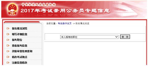 第二步:進(jìn)入錄用系統(tǒng)界面考生操作主頁之后,點擊右上角“報名情況瀏覽”按鈕進(jìn)入報名情況瀏覽頁面。