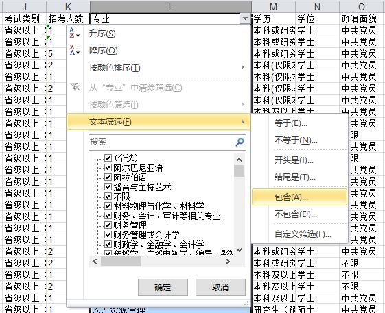 由于專業(yè)要求一欄包含的內(nèi)容繁多,通過普通篩選來尋找適合自己的職位“工作量”較大,因此中公網(wǎng)校專家建議考生使用文本篩選,通過搜索專業(yè)關(guān)鍵字來定位想要尋找的專業(yè),職位選擇效率。文本篩選的操作方法是:在篩選中點擊【文本篩選】,選擇【包含】,在文本框中輸入想要查詢的專業(yè),確定后專業(yè)要求列中顯示的即為篩選后的專業(yè)。