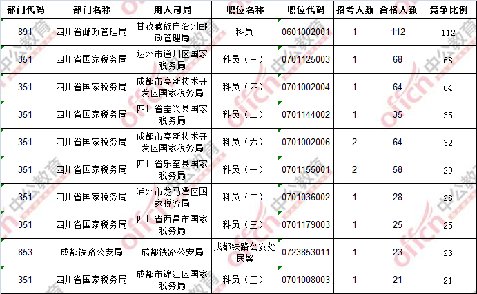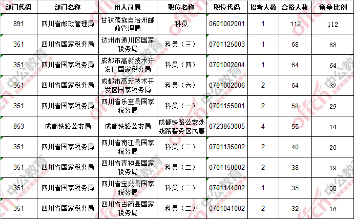 截止到16日16時,競爭比例的職位為‘甘孜藏族自治州郵政管理局科員’一職,招錄1人,截止到16日16時通過人數為112人。