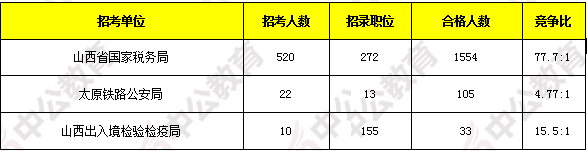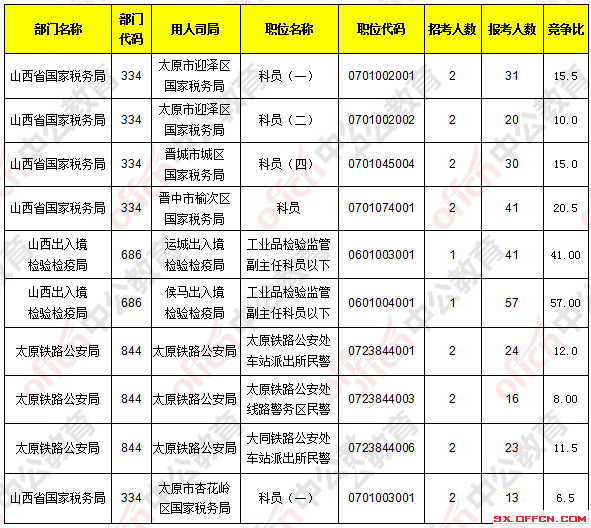 報(bào)考人數(shù)前十位的職位主要集中在山西省國(guó)家稅務(wù)局、山西出入境檢驗(yàn)檢疫局、太原鐵路公安等部門,具體信息如下: