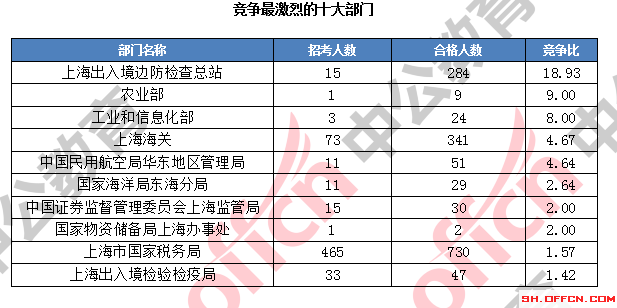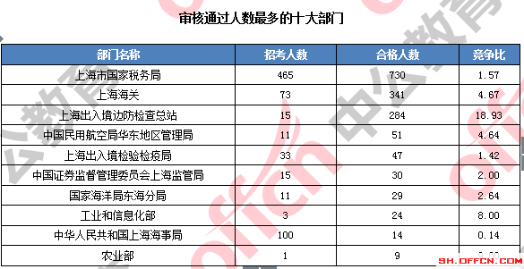 為幫助廣大考生更清晰的了解今日報名情況,上海中公網(wǎng)校整理了審核通過人數(shù)前十位的部門以及競爭比例最激烈的十大部門,供廣大考生參考: