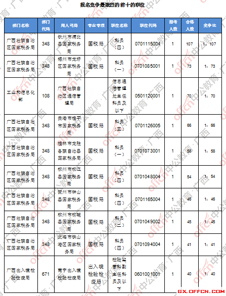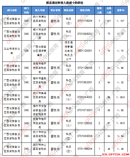 報名通過審核人數(shù)前十的職位主要集中在廣西壯族自治區(qū)國家稅務局、工業(yè)和信息化部等部門,具體信息如下:
