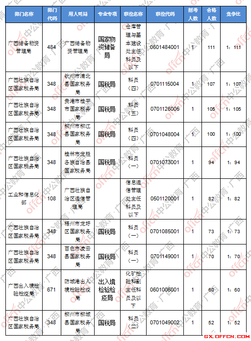 截止到18日8時(shí),工作地點(diǎn)在廣西的職位共有128個(gè)無人報(bào)考,占全部職位的19.9%。下面是部分廣西無人報(bào)考職位一覽表,更多無人報(bào)考職位詳情請(qǐng)下載附件,廣西中公網(wǎng)校專家建議廣大考生結(jié)合自身?xiàng)l件,根據(jù)自己的實(shí)際情況找到屬于自己的職位,避免激烈競爭。