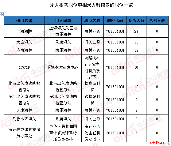 截止到18日8時(shí),2016國(guó)考共有2805的崗位報(bào)考人數(shù)還未破零,占18%。中公網(wǎng)校分析,共有25個(gè)職位招錄人數(shù)在5人以上,主要分布在鐵路公安、國(guó)稅和海關(guān)系統(tǒng)。中公網(wǎng)校專家建議考生可以從這些職位中選取適合自己的。