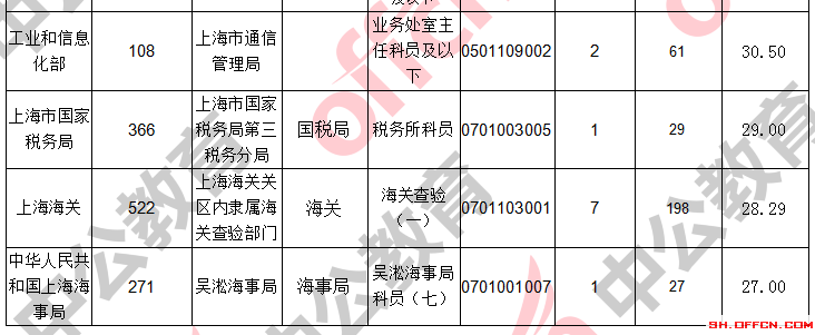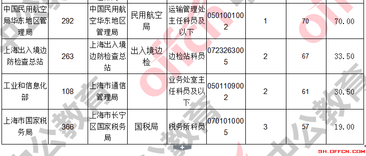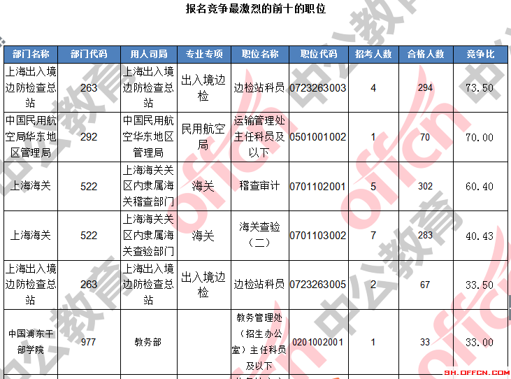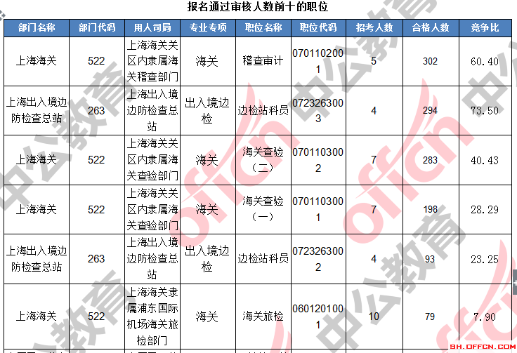 報名通過審核人數(shù)前十的職位主要集中在上海出上海海關(guān)、上海出入境邊防檢查總站、中國民用航空局華東地區(qū)管理局,具體信息如下: