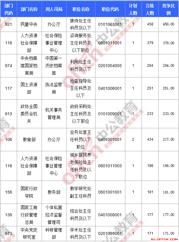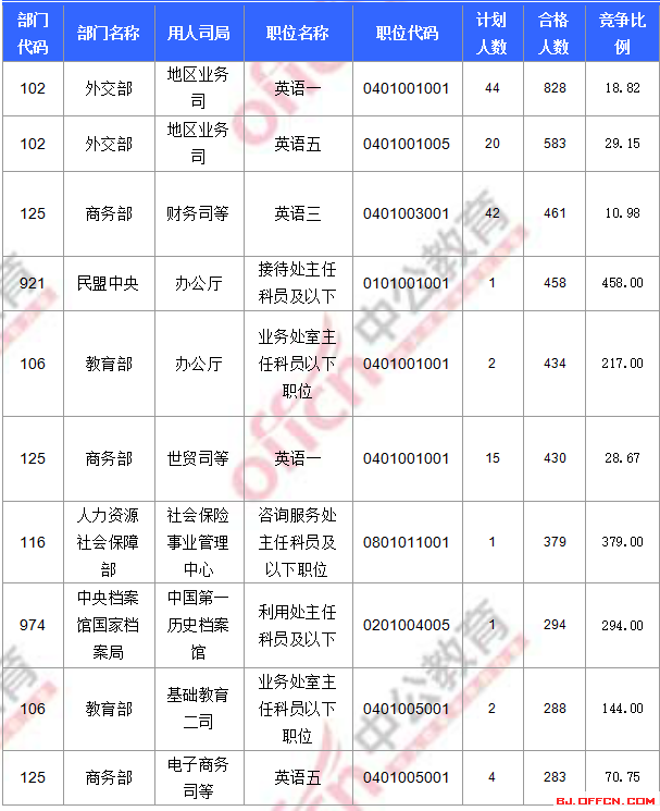 合格人數(shù)前十的職位主要集中在外交部、教育部、商務(wù)部等部門,具體信息如下: