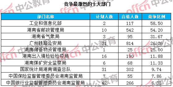 為幫助廣大考生更清晰的了解今日?qǐng)?bào)名情況,湖南中公網(wǎng)校整理了審核通過人數(shù)前十大部門以及競(jìng)爭(zhēng)比例最激烈的十大部門,供廣大考生參考: