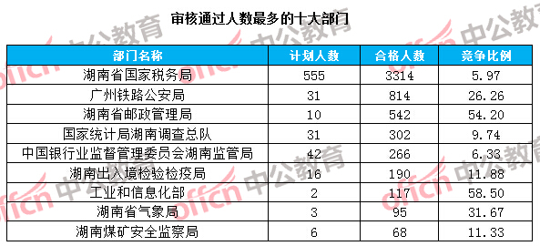 通過審核人數(shù)前三位的部門依次是:湖南省國(guó)家稅務(wù)局、廣州鐵路公安局、湖南省郵政管理局,三部門通過審核總?cè)藬?shù)為4670人,占通過審核總?cè)藬?shù)的80.13%。