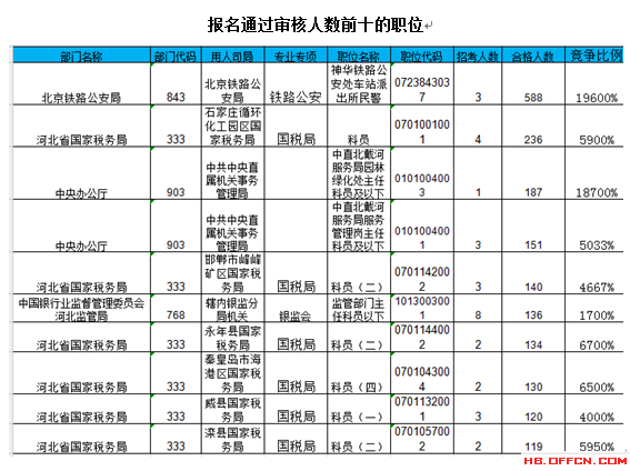報(bào)名通過(guò)審核人數(shù)前十的職位主要集中在北京鐵路公安局、河北省國(guó)家稅務(wù)局、中央辦公廳等部門,具體信息如下: