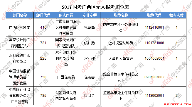 截止到19日16時(shí),工作地點(diǎn)在廣西的職位共有47個(gè)無人報(bào)考,占全部職位的7.3%。下面是部分廣西無人報(bào)考職位一覽表,更多無人報(bào)考職位詳情請下載附件,廣西中公網(wǎng)校專家建議廣大考生結(jié)合自身?xiàng)l件,根據(jù)自己的實(shí)際情況找到屬于自己的職位,避免激烈競爭。