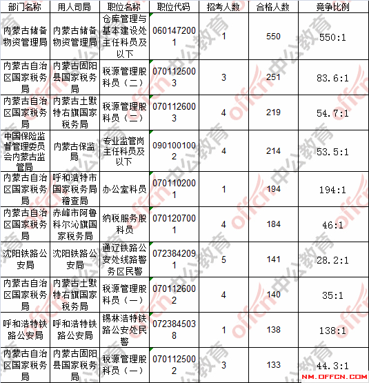 報名通過審核人數(shù)前十的職位主要集中在內(nèi)蒙古儲備物資管理局、內(nèi)蒙古固陽縣國家稅務(wù)局、內(nèi)蒙古土默特右旗國家稅務(wù)局等部門,具體信息如下: