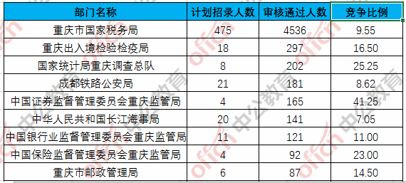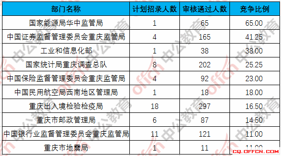 為幫助廣大考生更清晰的了解今日報名情況,重慶中公網校整理了合格人數前十位的部門以及競爭比例最激烈的十大部門,供廣大考生參考: