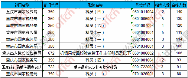 合格人數(shù)前十的職位主要集中在重慶市國(guó)家稅務(wù)局、重慶出入境檢驗(yàn)檢疫局、國(guó)家統(tǒng)計(jì)局重慶調(diào)查總隊(duì)等部門,具體信息如下:
