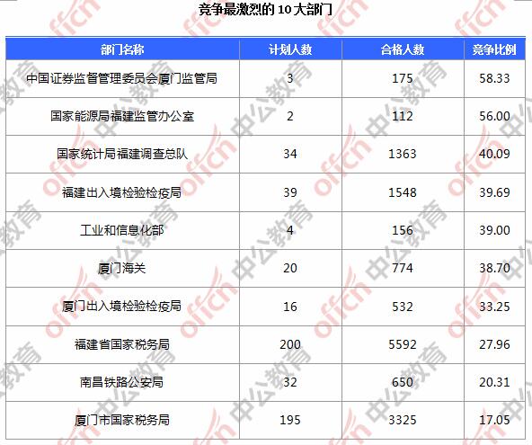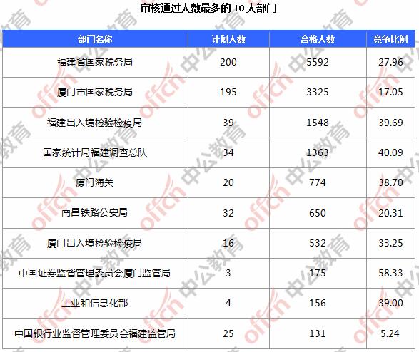 為幫助廣大考生更清晰的了解今日報(bào)名情況,福建中公網(wǎng)校整理了審核通過人數(shù)前10位的部門以及競爭比例最激烈的10大部門,供廣大考生參考: